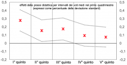 Sebbene l’effetto medio non fosse molto grande in termini assoluti, l’indicazione più interessante la si ottiene disaggregando le stime per gli intervalli dei voti a scuola, cioè ordinando gli studenti per “livelli di abilità”. Come mostra la figura, i benefici della strategia si concentrano tra coloro che si trovano nella coda sinistra della distribuzione dell’abilità scolastica, con l’effetto stimato che risulta il doppio rispetto a quello medio (circa il 30 per cento di una deviazione standard nei punteggi Invalsi nel primo quinto della distribuzione).