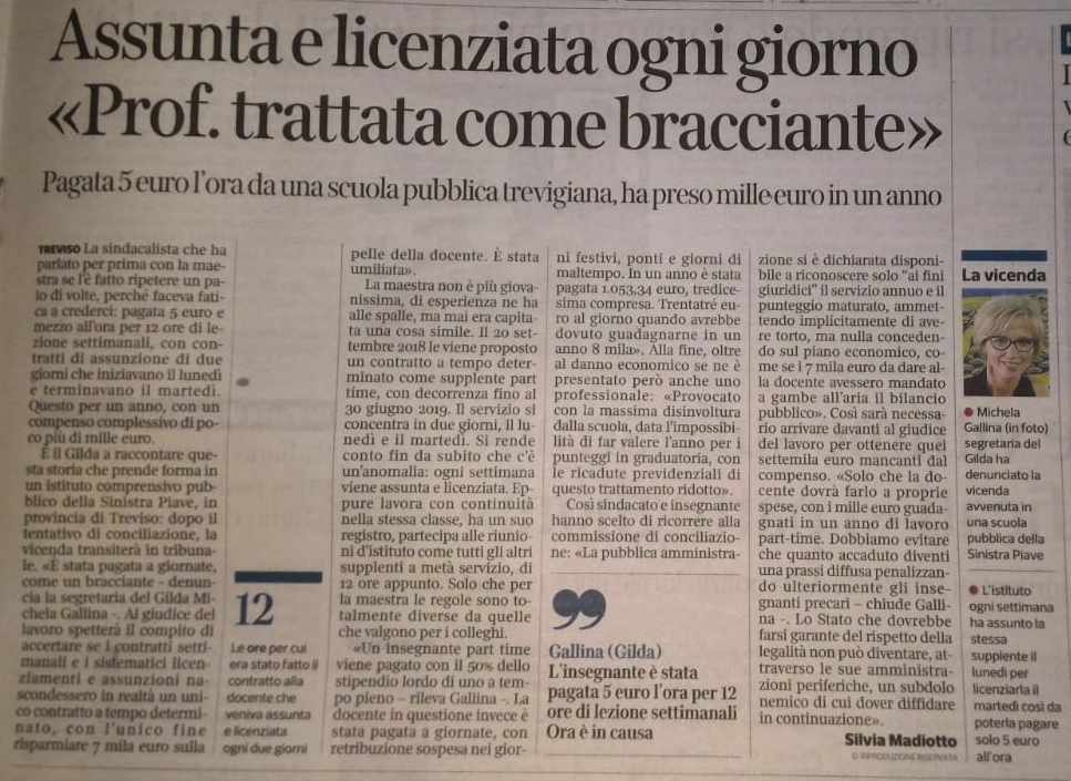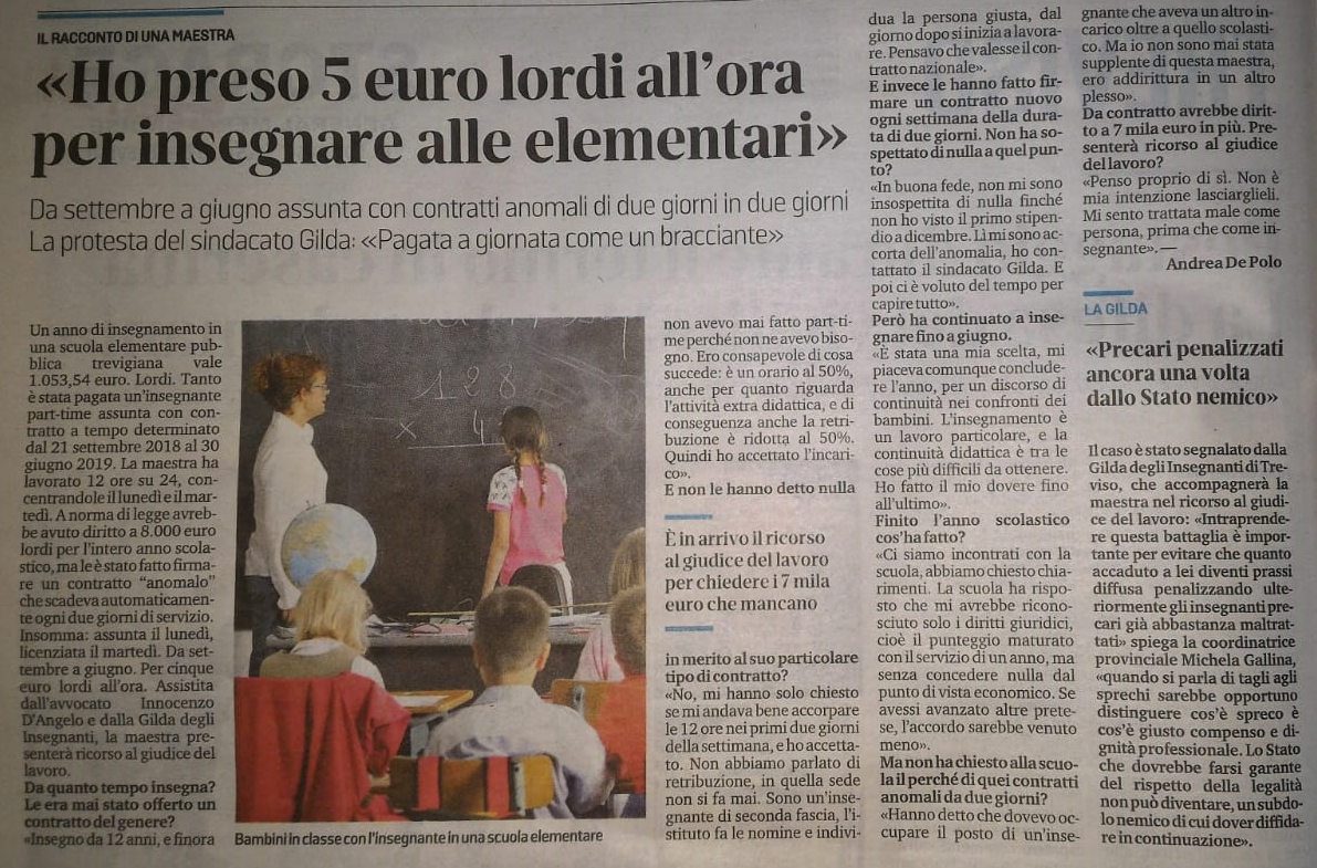 Ora, sostiene Michela Gallina, Coordinatrice della Gilda degli Insegnanti di Treviso, alla docente non resta che difendersi davanti al Giudice del Lavoro per vedersi riconoscere l’elementare diritto alla giusta retribuzione per il lavoro svolto e, come aggravante, lo dovrà fare a sue spese”.