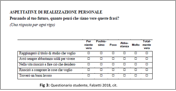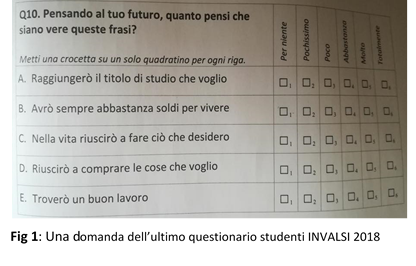 Il quesito, al quale l’INVALSI non associa alcuna provenienza, è il famoso quesito “sui soldi”, fonte delle polemiche della primavera scorsa. Da una ricognizione della letteratura di riferimento, sembra che i 5 items scelti dall’INVALSI per misurare le aspettative dei nostri studenti siano l’adattamento di un test del 2008 elaborato da due studiosi americani (E. Mc Whirter e B. Mc Whirter) denominato FESA, ossia Future Expectations Scale for Adolescents, riportato in Fig. 4.