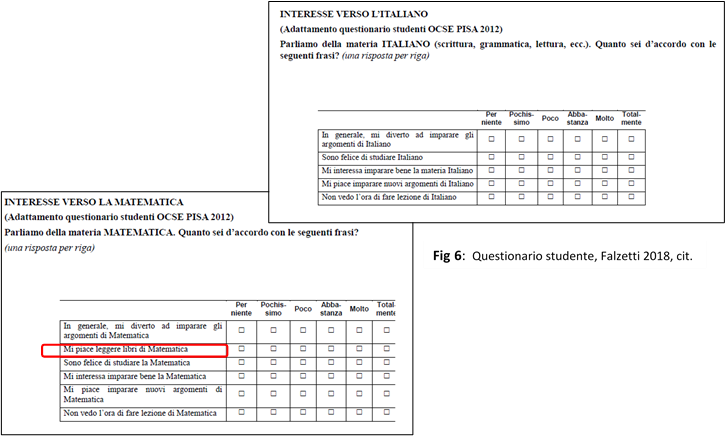 Una curiosità: sarebbe interessante sapere perché si sia ritenuto importante aggiungere un item al blocco riguardante la matematica e cioè: “Mi piace leggere libri di matematica”.Come se i piccoli lettori di 10 o 13 anni potessero “divorare” libri di algebra o aritmetica o tenerli sul comodino come si fa con Harry Potter.