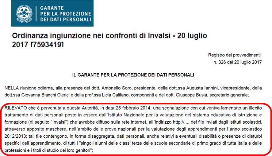 Non ci si può limitare a dire genericamente “così fan tutti” , ovvero “quelle domande sono fondamentali per approfondire il fenomeno della dispersione scolastica” o per “garantire un futuro migliore per i nostri studenti” (come di fatto l’INVALSI ha dichiarato nella nota stamparilasciata dopo le polemiche suscitate) di fronte a quelli che sembrano a tutti gli effetti violazioni di principi generali, se non lesioni di diritti soggettivi. Oltretutto, di recente (Luglio 2017) l’INVALSI è stato condannato a pagare una sanzione pecuniaria da parte del Garante della privacy per aver reso pubblici dati personali anche idonei a rivelare lo stato di salute degli studenti che hanno svolto il test nel 2013 (vedi Fig. seguente).